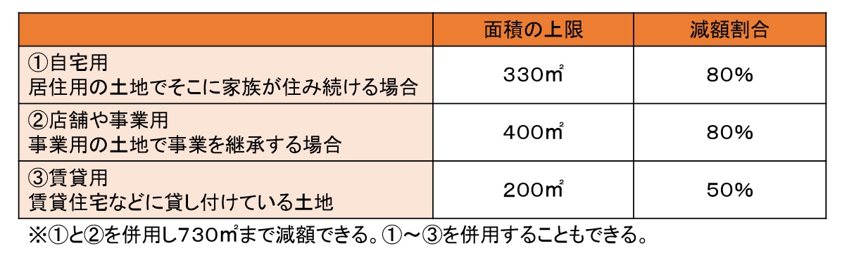 お店などの家業に使っている土地も生計の基盤となりますから、400㎡まで80%の評価減が認められています。アパートやマンションなどに使う土地として人に貸している場合は200㎡まで50%が評価減されます。